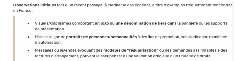 Le thème général des messages concernés est que votre entreprise ou votre association aurait commis des violations des droits à la propriété intellectuelle de nos clients (logo, photographies, etc.) Or notre cabinet n’intervient pas dans ce domaine du droit.